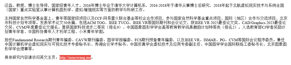 姓名:Wang Miao 职称:Professor 座机: 邮编:100191 办公地址:北京麻豆精品秘 国产传媒新主楼 电子邮箱:miaow@cq5520.com 个人主页:http://shi.cq5520.com/wangmiao